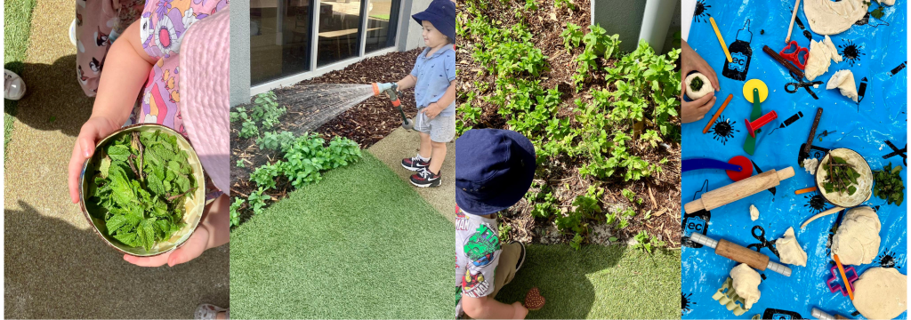 Junior Kindy children at our Children First Early Education Mitcham centre harvest their herbs to add to their play dough, creating a sensory experience.