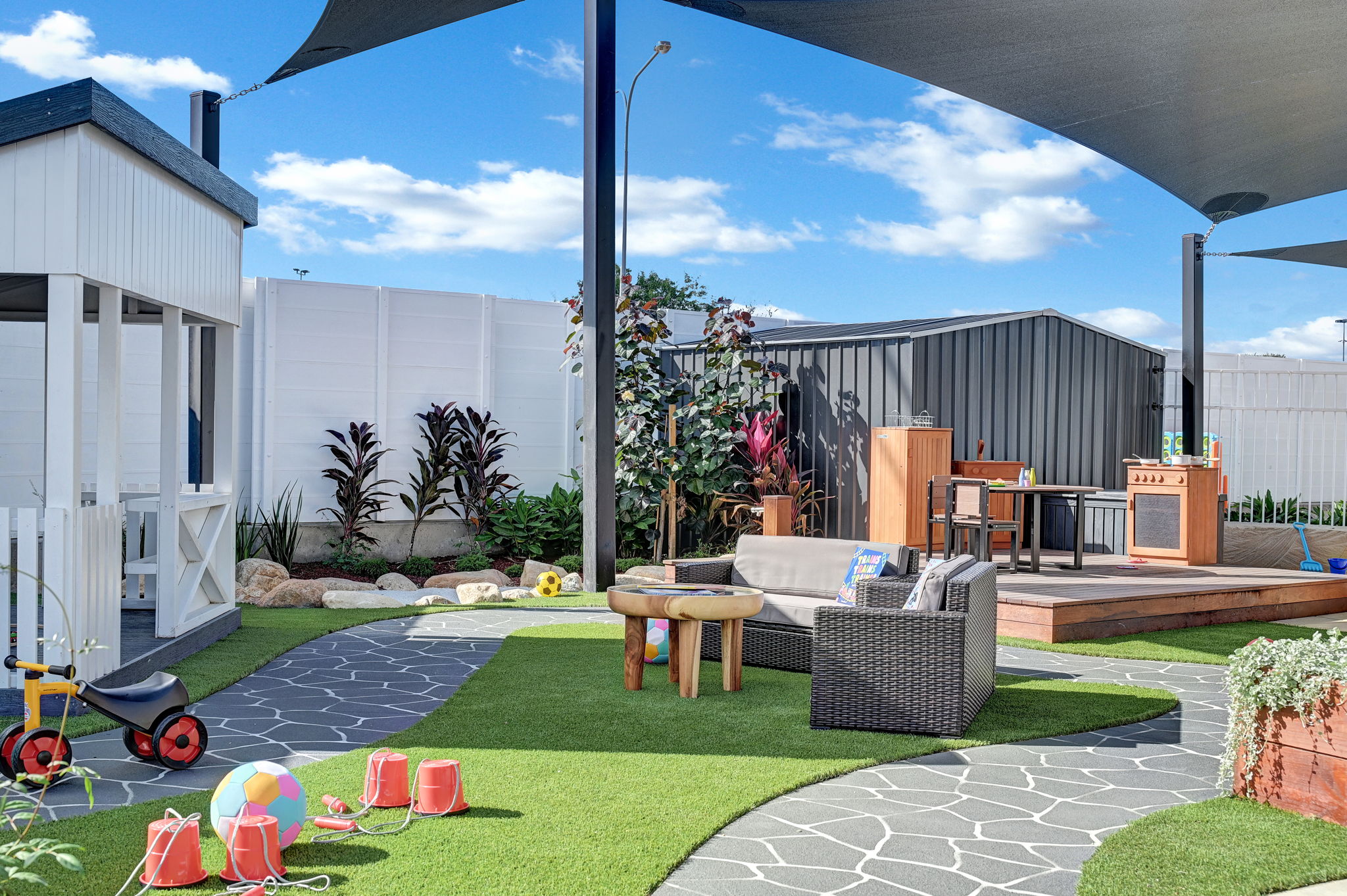 The large outdoor area at Children First Fairfield provides children with the space for big movements like running, jumping, kicking and throwing, which is very important for fitness and physical development. From sandpits and bike tracks, to custom adventure forts and vegetable gardens - your little one is going to have so much fun exploring and playing in our beautiful outdoor playscapes.