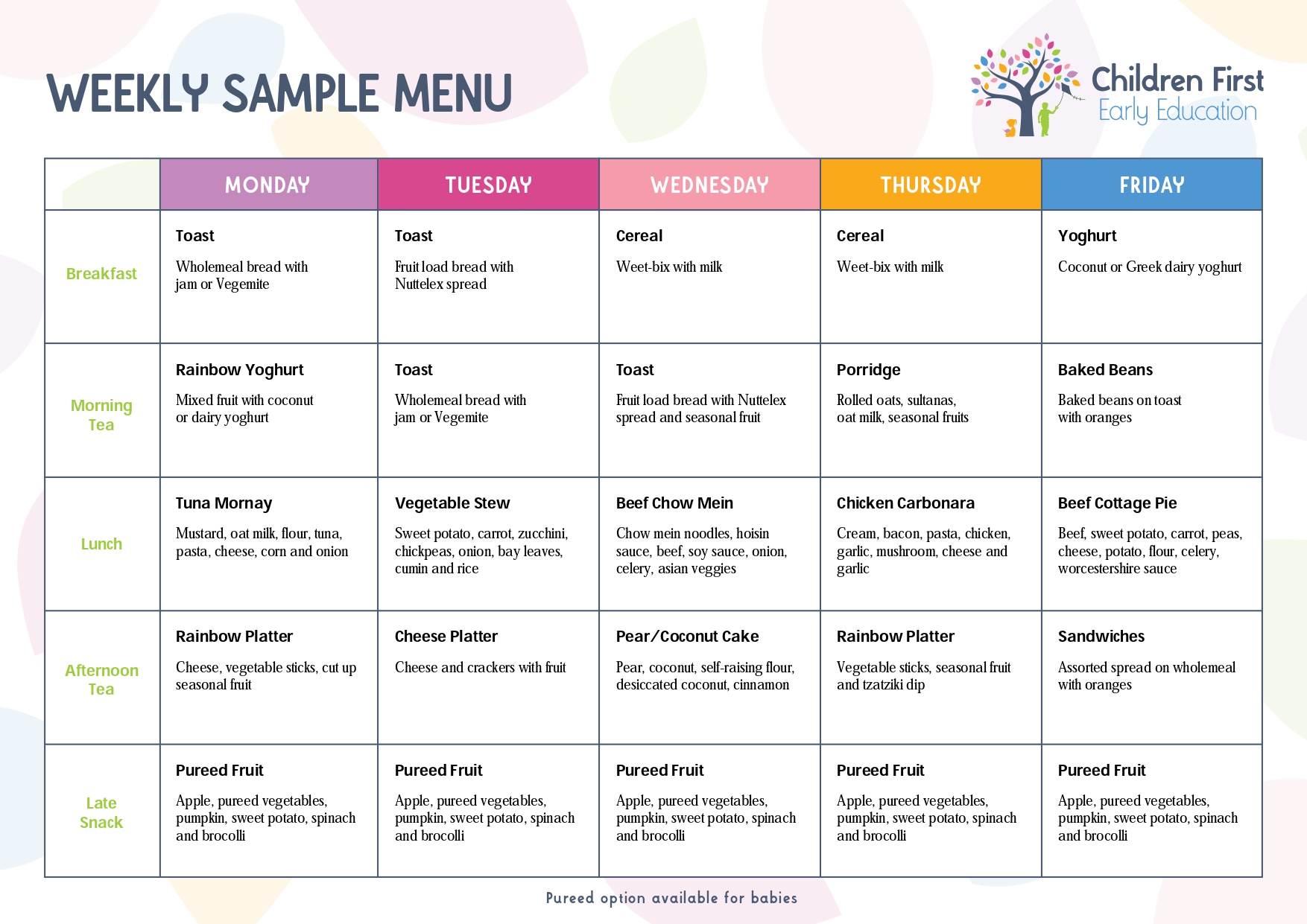 Menus are carefully reviewed each season to ensure they meet nutritional standards and provide the variety children need for growth and wellbeing.
