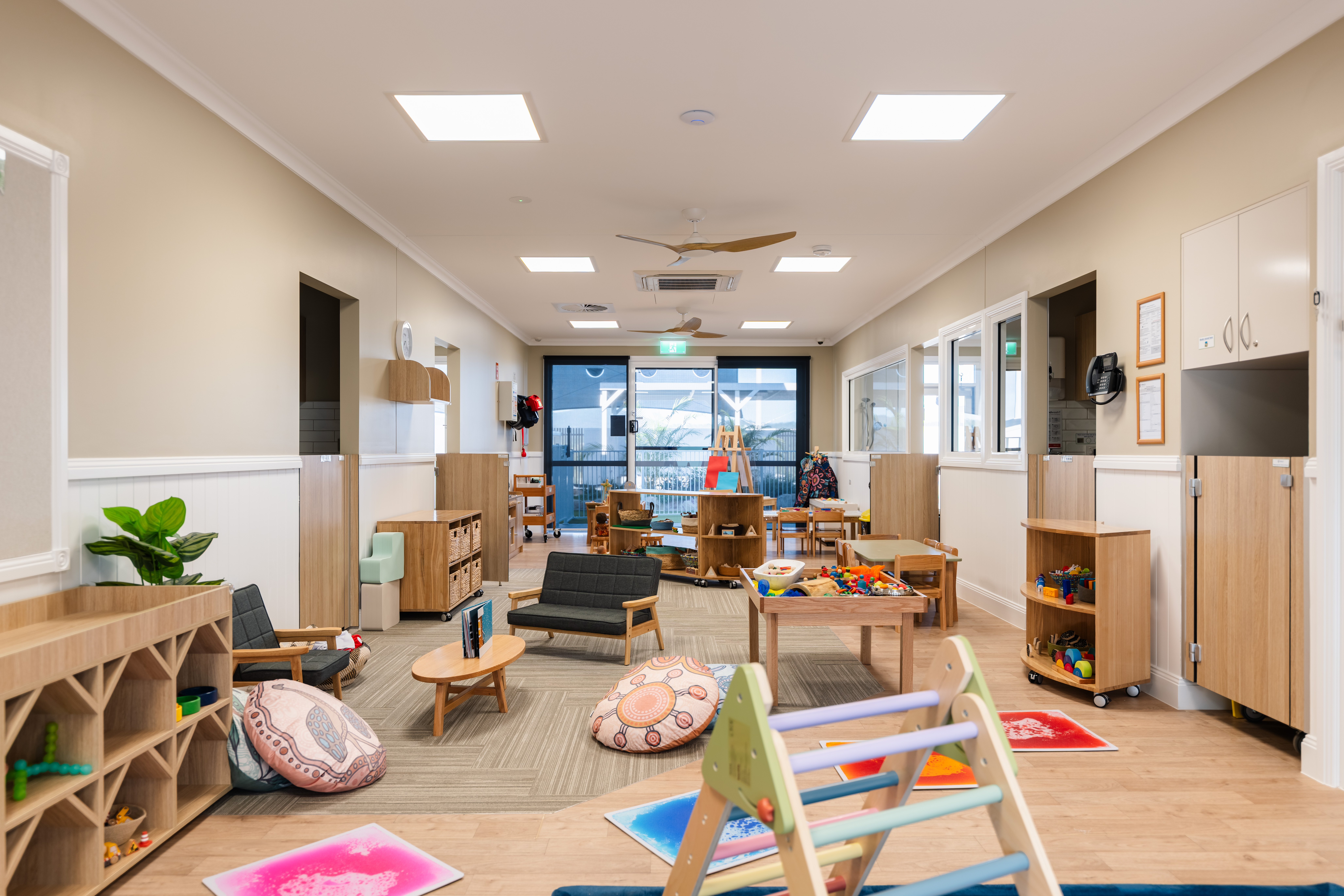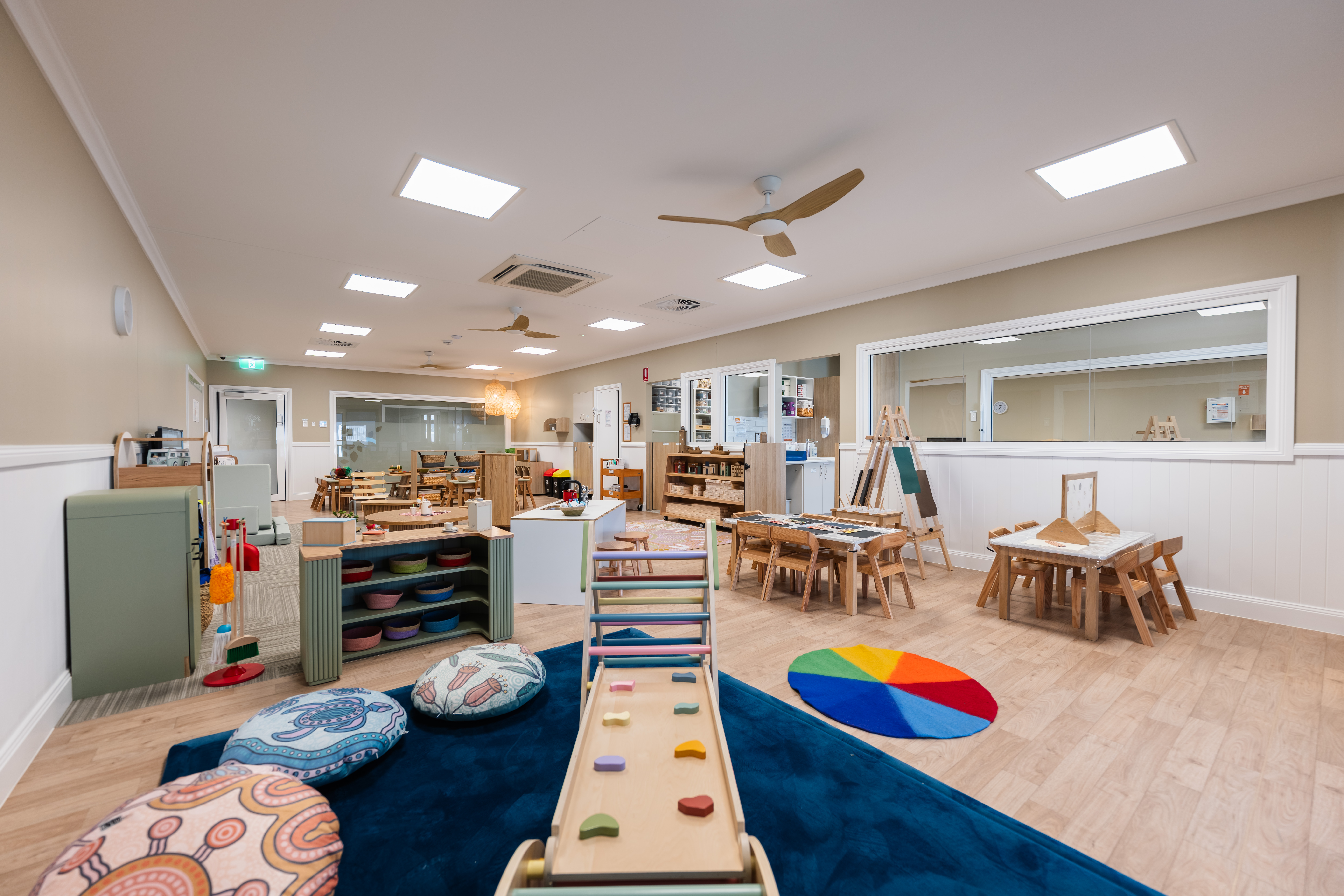 Our modern classrooms are equipped with high quality, natural educational resources, chosen to complement our curriculum and support your child’s learning journey. Within our classrooms, you will discover smaller spaces designed to make children feel secure and truly at home, including home corner, reading nooks, art studio spaces, floor & table activities and other inspiring play zones. These carefully curated spaces foster meaningful interactions between our children and Educators, promoting quality engagement and learning experiences.
